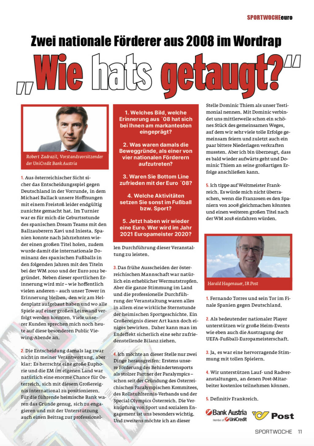 2. Die Entscheidung damals lag zwar nicht in meiner Verantwortung, aber klar: Es herrschte eine große Euphorie und die EM im eigenen Land war natürlich eine enorme Chance für Österreich, sich mit diesem Großereignis international zu positionieren. Für die führende heimische Bank waren das Gründe genug, sich zu engagieren und mit der Unterstützung auch einen Beitrag zur professionellen Durchführung dieser Veranstaltung zu leisten.