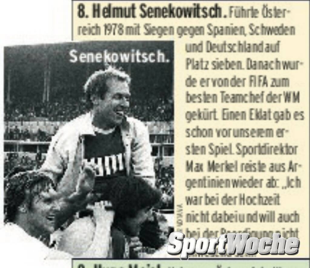 30.06.1978: ÖFB-Nationalteam - Helmut Senekowitsch: Ende als Trainer ÖFB-Nationalteam: 26 Spiele: 14 Siege, 4 Unentschieden, 8 Niederlagen - Tore: 40:26. Punktekoeffizient: 1,77 (5. von 27 Teamchefs gereiht nach Punktekoeffizient)